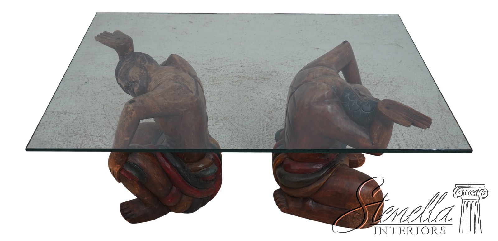 F63878EC: Asian Figural Carved Base Glass Top Coffee Table