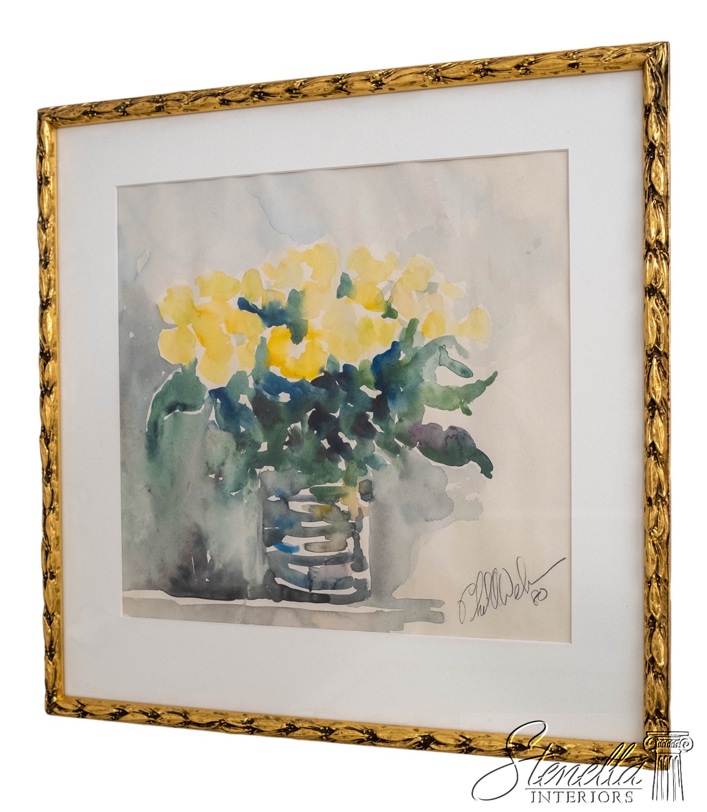 F69231: Abstract Yellow Flowers In Vase Watercolor Painting Signed