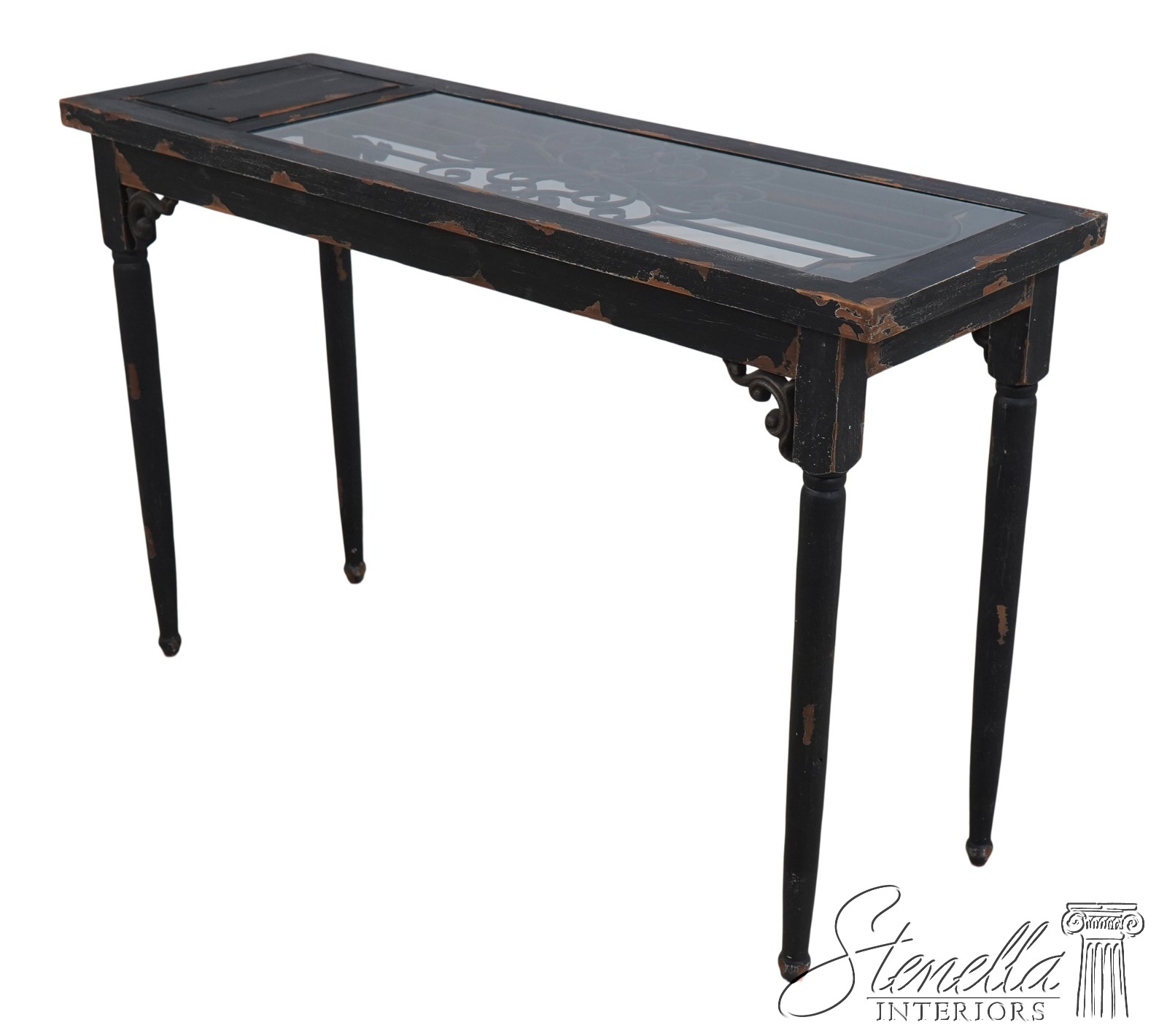 69981: Continental Glass Top Iron & Wood Distressed Paint Console Table
