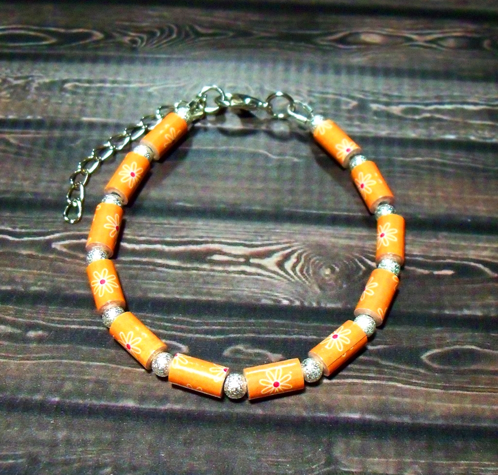 Type(s) | Bracelet | Paper Color(s) | Orange | Main Metal Color | Silver | Clasp | Lobster | Length | 6 3/4 Inches w/ extender | Change Size | Yes! We can go up or down in size ($0.50 fee) | Item Number | 71 | Care of ALL Paper Bead Jewelry | The beads are sealed for better durability. This makes them water resistant and not water proof. So a light rain would be okay but maybe not a shower and they really frown on helping with the dishes |
