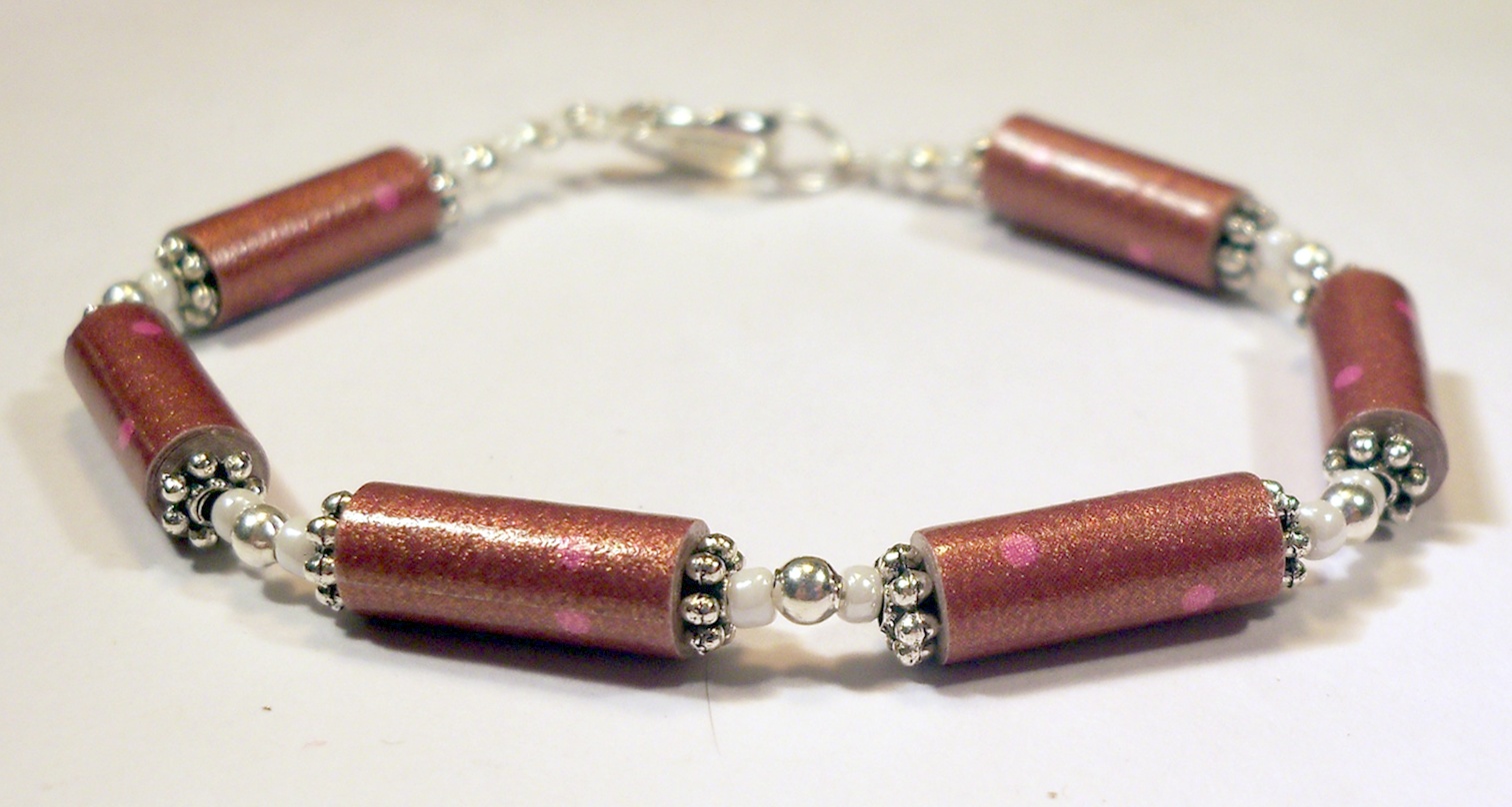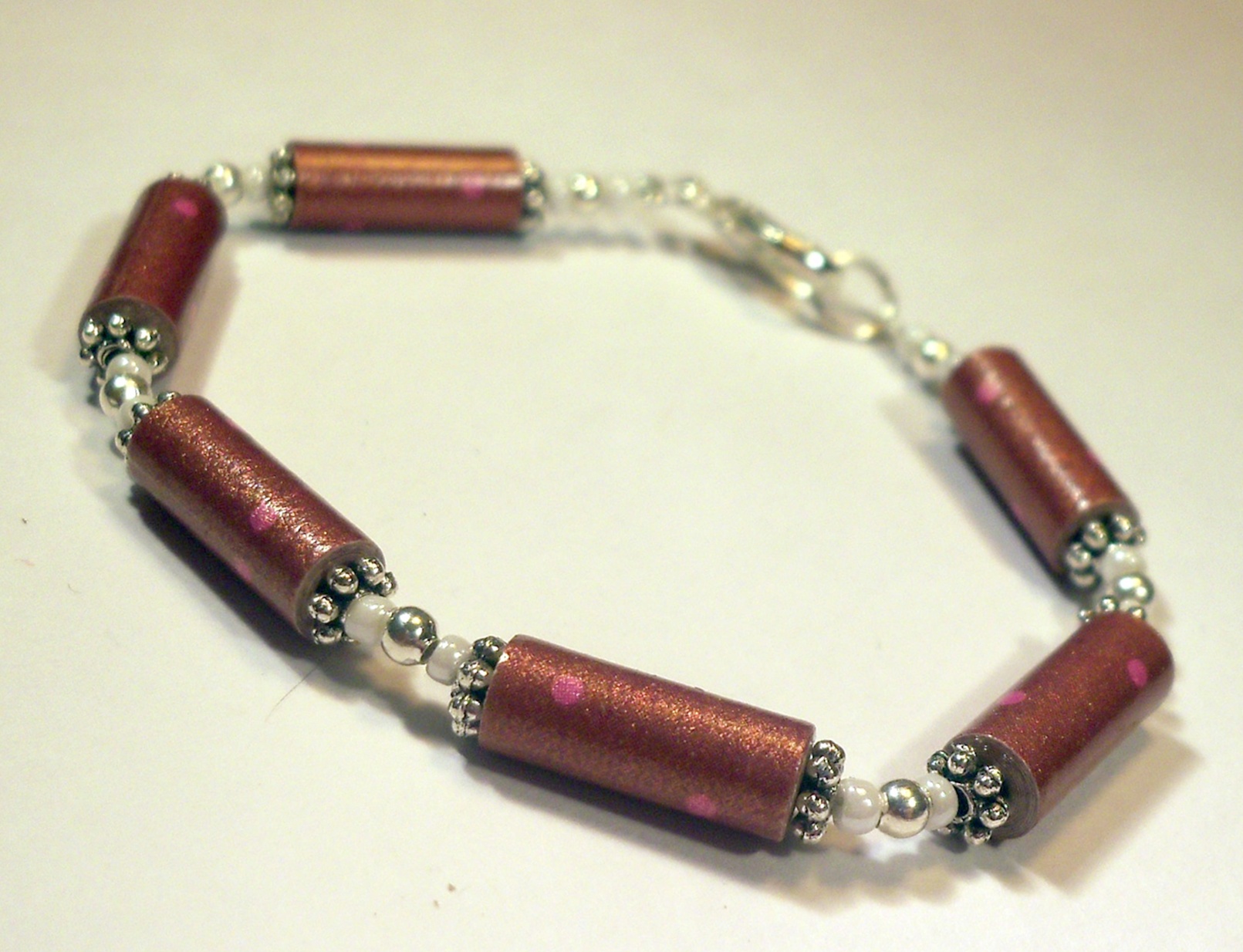 Shimmery Brick Red Paper Bead Bracelet With Silver and White Child's Size