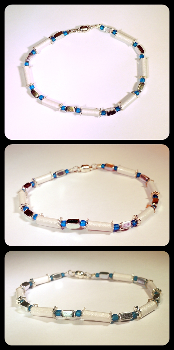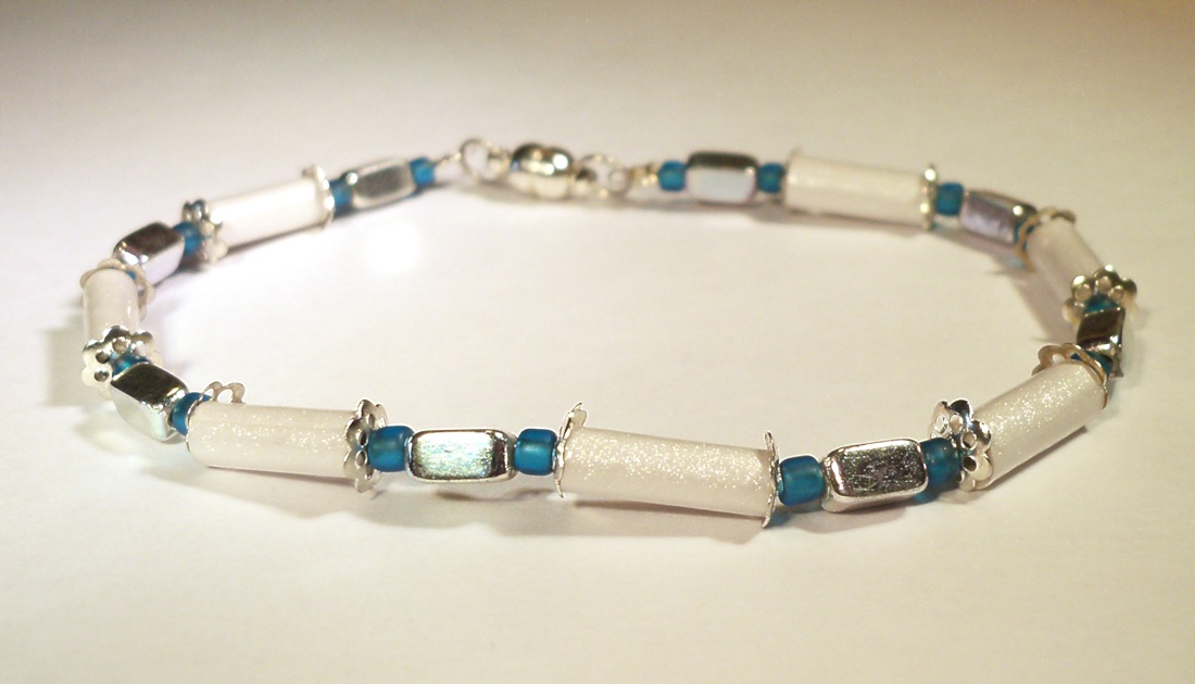 Shimmery Pearl White Paper Bead Bracelet Silver and Blue Accents