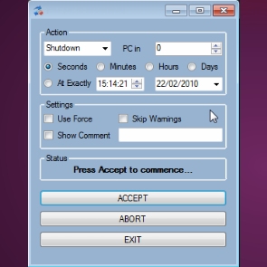 Easily shutdown, logoff, restart or hibernate your PC automatically using various methods. These include at a set precise time, or after x seconds/hours or minutes. You can also force the action and avoid warning messages.