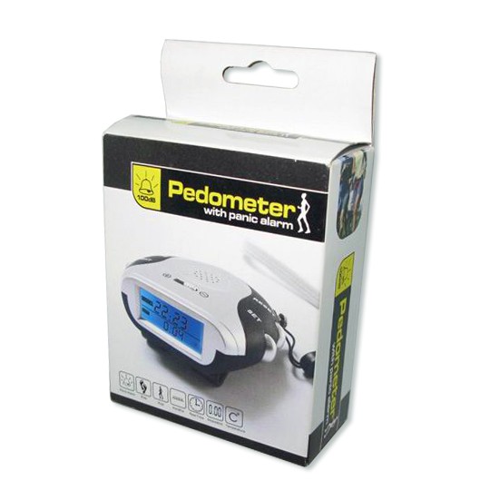 This tiny pedometer with contemporary design keeps you motivated and helps keep you safe! Its functions measures your steps taken (walk, rapid walk and/or run), distances ran (kilometers and/or miles), and calories burned. It has a time clock, stopwatch and even a temperature indicator (displayed in Celcius and/or Farenheit). Portable and easy to use, you can quickly pull the strap of which will cause the pedometer to start its alarm. This pedometer also measures progress toward and estimates time to reach goal distance. This item requires two AAA batteries (not included). Give a workout boost to yourself!