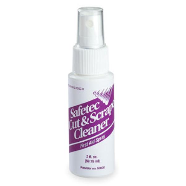 "2 oz. Safetec Cut Spray Bottle. Provides temporary pain relief and aids in preventing infection in minor cuts, scrapes and abrasions. Safetec Cut is available in an antiseptic towelette or 2 oz. ""no touch"" spray dispenser. Our convenient packaging options make them a perfect fit in a first aid kit, glove compartment, drawer, or pocket. Made in USA " Case Pack 24
