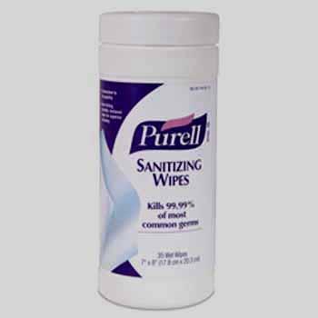 "PURELL Sanitizing Wipes. Use anytime for quick cleanup. Non-linting, durable, textured wipe for superior cleaning; formulated to dry quickly. Dermatologist tested. 7 x 8 Size Wipes. 12 Canisters per Case. 35-Count Canister." Case Pack 12