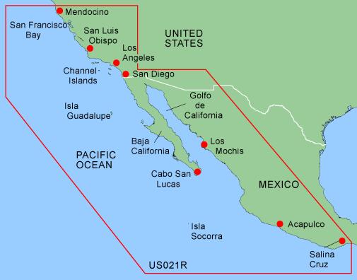 Point Arena to Puerto Vallarta, including Mendocino, San Francisco Bay, Channel Islands, San Diego, and the Baja Peninsula . General coverage for the Mexican coast, including Mazatlan, Acapulco and Salina Cruz.