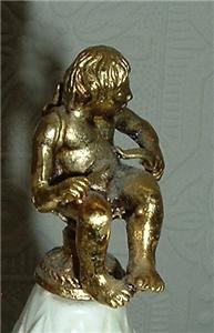 Each white panel, the top. and base are decorated with Putti. The brass base has satyr faces for feet. The music box stands 15" tall and plays a Mozart Minuet.