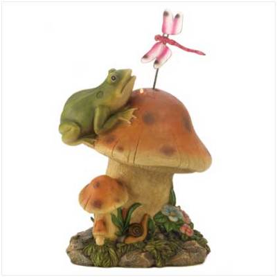 A plump green toad shares his perch with a dancing dragonfly in this fairy tale scene of forest fun. This playful statue adds a gleeful nighttime glimmer to your garden with hidden LED solar lights!
