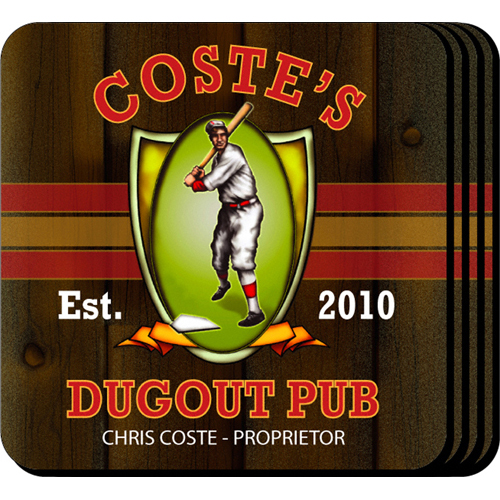 Our personalized coasters are a perfect accessory to any bar or family room. This set of four richly detailed, waterproof coasters reflect his favorite activity. Personalized design is printed in full color onto a non-skid cork base. Includes 4 coasters and mahogany caddy. Each coaster measures 3 3/4" x 3 3/4". Specify design and personalize with first name, last name and established year. Please utilize the "notes" field during checkout to add personalization and any instructions. We will produce the text exactly as you have entered/written it in the font shown. You may also e-mail additional information after checkout. Please include your order number and item number and send to [email protected].