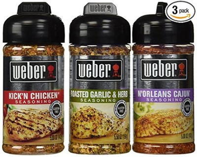 - Weber All Natural Seasoning Blend 3 Flavor Variety Bundle: (1) Weber N'Orleans Cajun Seasoning Blend, (1) Weber Roasted Garlic & Herb Seasoning Blend, and (1) Weber Kick'N Chicken Seasoning Blend, 5.0 - 5.5 Oz. Ea.