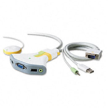 Share one monitor, keyboard and mouse between two computers. Wired remote control makes switching between machines as quick and easy as pushing a button. Installs in three easy steps with no software required. Supports video resolution up to 2048 x 1536. Connector/Port/Interface: Audio; USB; VGA; For Use With: N/A; Number of Ports: 2; Connects Devices (From/To): Computer to Keyboard, Monitor, Mouse and Speakers.