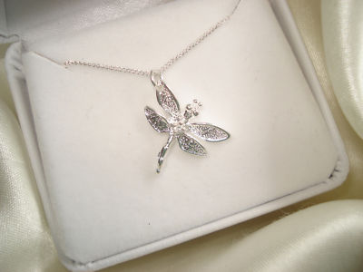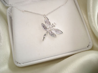 This is a 925 Sterling Silver PLATED Dragonfly PENDANT. It has a tiny Cz. stone in the middle of the Dragonfly. The pendant measures 5/8 inch wide x 3/4 inch down including the tail.