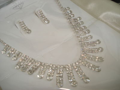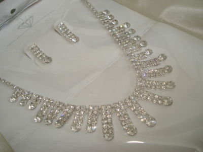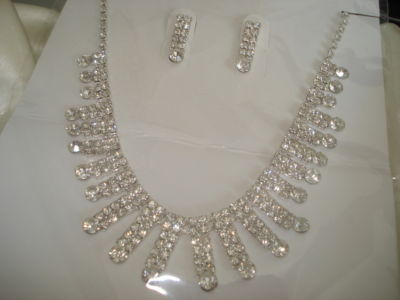 This is a Silver PLATED BRIDAL- EVENING NECKLACE WITH MATCHING EARRINGS WHICH ARE CLIP ONS WITH SCREW TO FIT EARLOB IN BACK. THE EARRINGS ARE ONE INCH LONG AND THE NECKLACE IS 16 - 1/2 INCHES LONG . ~ JUST BEAUTIFUL FOR HOLIDAYS, WEDDINGS, ANNIVERSARIES, OR THE SPECIAL EVENING GALA AFFAIRS ;)