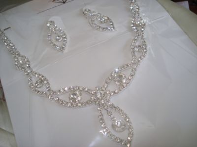 This is a Silver PLATED BRIDAL- EVENING NECKLACE WITH MATCHING EARRINGS WHICH ARE CLIP ONS WITH SCREW TO FIT EARLOB IN BACK. THE EARRINGS ARE ONE 1-1/4 INCH LONG AND THE NECKLACE IS 16 - 1/2 INCHES LONG . ~ JUST BEAUTIFUL FOR HOLIDAYS, WEDDINGS, ANNIVERSARIES, OR THE SPECIAL EVENING GALA AFFAIRS ;)