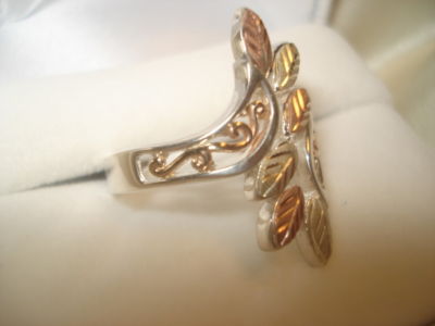This is a very pretty OBLONG RING -it has 6 large 12k Gold Leafs, ~three of green and three of rose Gold~ The ring also has two sort of S swirls on either side of the big Leafs wich are of 10 k GOLD. Its almost like a Filligree design. So the ring sows MOSTLY ALL GOLD on top with very little Sterling silver around the edge of the gold swirls, and of course the back hand band of the ring is 925 Sterling Silver.