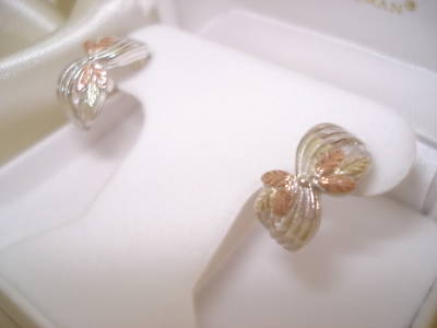 Here we have a pair of Black Hills Gold/silver 1/2 Hoop Earrings with SIX 12kt GOLD Leafs, ~ 2 of green and 4 of rose Gold in each earring. Just unbelieveable CUTE AND PRETTY in real life. Too bad the camera can't capture the REAL BEAUTY of these Earrings ! They have 9.25 Sterling Silver Posts and backs.