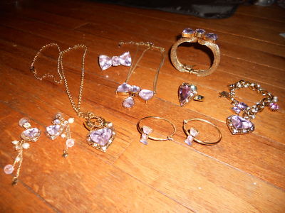 THIS IS A GORGOUS BETSEY JOHNSON JEWELRY COLLECTION. 1 NECKLACE IS 34" LONG WITH A PINK CRYSTAL HEART .WITH GOLD AROUND IT. THE OTHER NECKLACE IS SHORTER WITH A PINK CRYSTAL BOW AND RHINESTONE HANGING FROM THE BOW. 1 BRACELET IS A GOLD BANGLE WITH A PINK CRYSTAL BOW. 1 BRACELET IS A TOGGLE WITH A PINK CRYSTAL HEART GOLD. THE EARRINGS ARE GOLD HOOPS WITH PINK CRYSTAL BOWS ON THE FRONT. THE RING IS A DOUBLE FINGER RING (ADJUSTABLE) WITH A BIG PINK BOW ON IT. THE ONE PAIR OF EARRINGS ARE PINK CRYSTAL HEARTS AND CHAINS AND PEARLS HANGING FROM THE HEART. THIS IS ACTUALLY 2 JEWELRY SETS THAT I'M SELLING TOGETHER BECAUSE THE MATCH SO WELL. THESE ARE VERY VERY BEAUTIFUL PIECES TO HAVE IN YOUR COLLECTION. THE OTHER RING I POSTED IS A HEART IN PINK CRYSTAL WITH A GOLD STRETCH BAND. THE OTHER RING IS A TWO FINGER RING WITH A PINK CRYSTAL BOW VERY LARGE. BOTH SETS ARE DEFINATELY STATEMENT PIECES! THEY ARE FUN AND WHIMCICLE LIKE BETSEY JOHNSON DESIGNS!