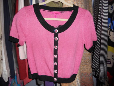 THIS IS A GORGOUS BETSEY JOHNSON SWEATER CARDIGAN STYLE WITH BRIGHT CRYSTAL BUTTONS AND AN OUTLINE OF MARILYN MONROE'S FACE WITH CRYSTALS ON THE BACK. THE SWEATER WOULD BE GREAT FOR THE HOLIDAYS, IT CAN BE WORN WITH JEANS OR BLACK TROUSERS OR LEGGINGS. HITS AT THE WAIST AND SHORT SLEEVED. HAS CRYSTALS ON THE BACK AS WELL. BEAUTIFUL MUST HAVE SWEATER!