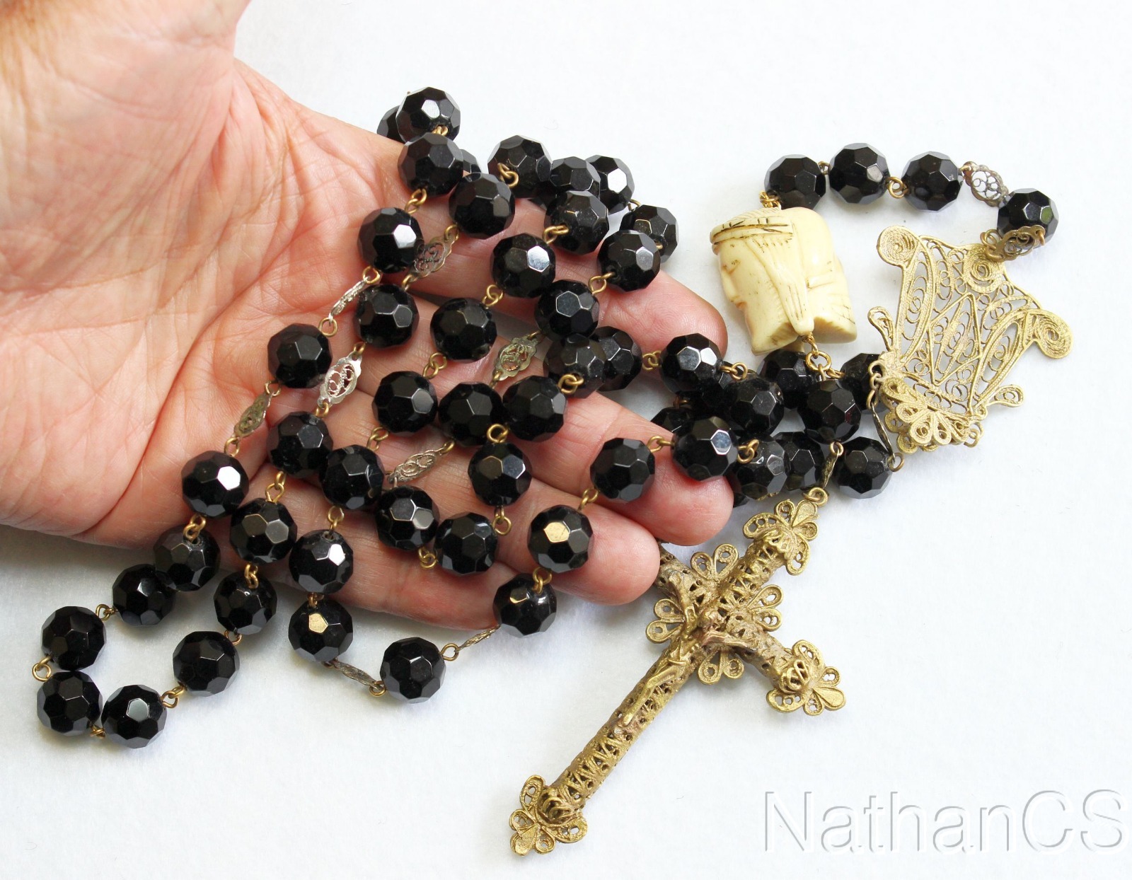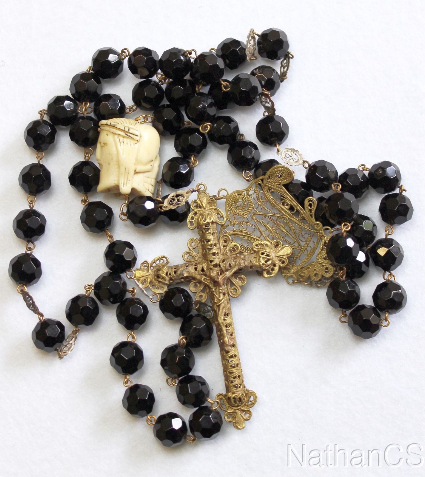 1) 12 mm average Vintage hand faceted Jet beads for the Ave Marias and same beads for the Pater Nosters . The Paters are separated from the Aves by Vermeil filigree separators.