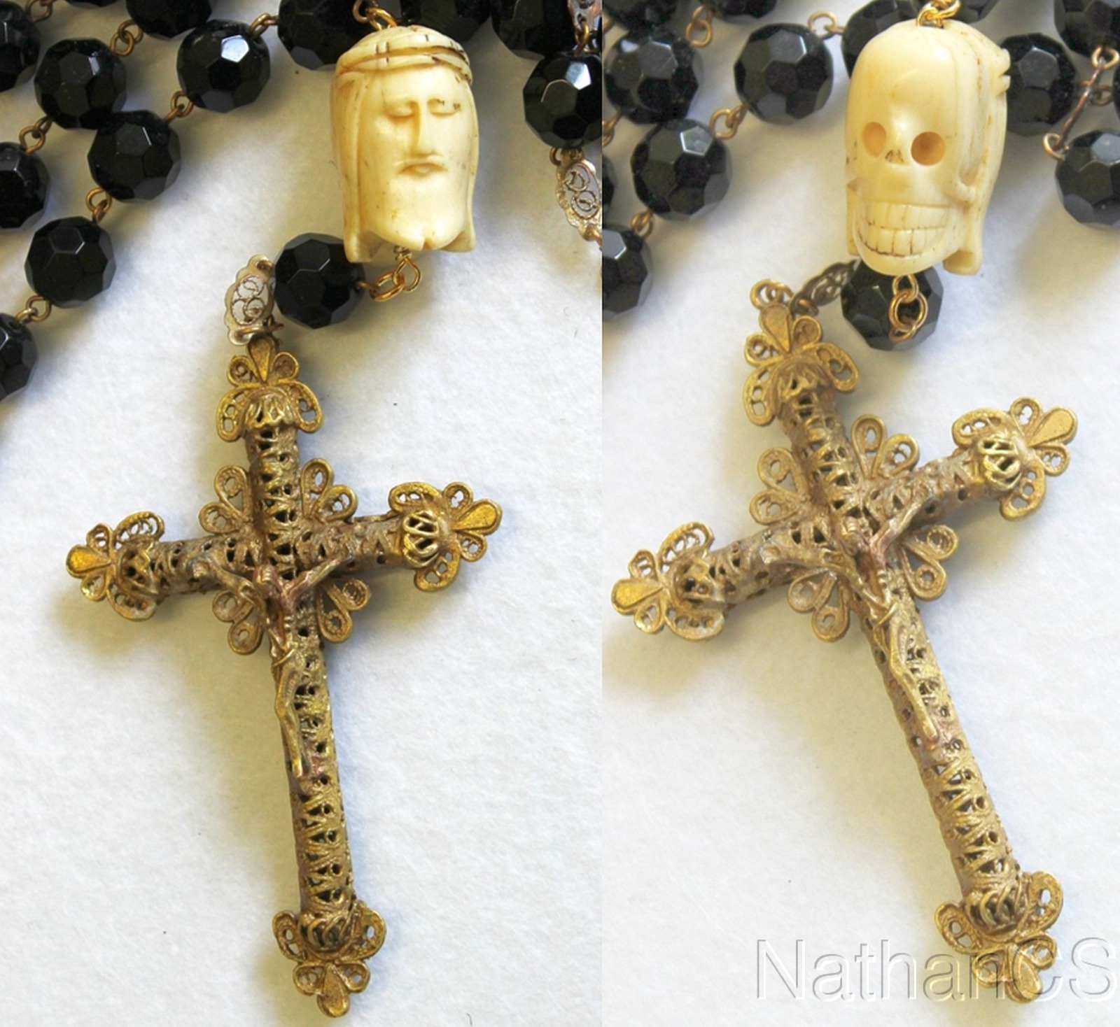 Jet & Vermeil 19th Cent. Catholic Rosary w Janus Memento Mori Bead Top Rarity