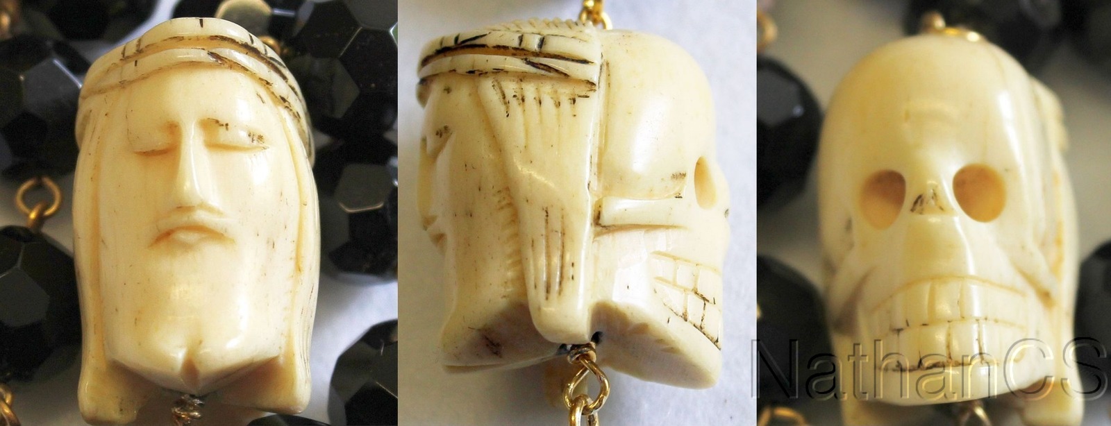 7. Very interesting and highly rare Memento Mori large Janus bead of noble material near the cross. Memento Mori means in Latin: “Remember that you will die”. Janus bead refers to a bead with two sides with opposite representations: Young and old, live face and skull… On this rosary is a bead representing live Jesus on one side and death on the other. It is related to a reflection on mortality, especially as a means of considering the vanity of earthly life and the passing nature of all earthly goods and pursuits. The Memento Mori bead has a size of 28 x 23 mm ( 1.12 x 0.92 in.) and a beautiful carving. There is a big possibility that it dates earlier than the rosary to be of the 17th century. Unlike all other items available for sale this bead is not a simple skull bead but a two faced bead which is the original item to be used on such rosaries.