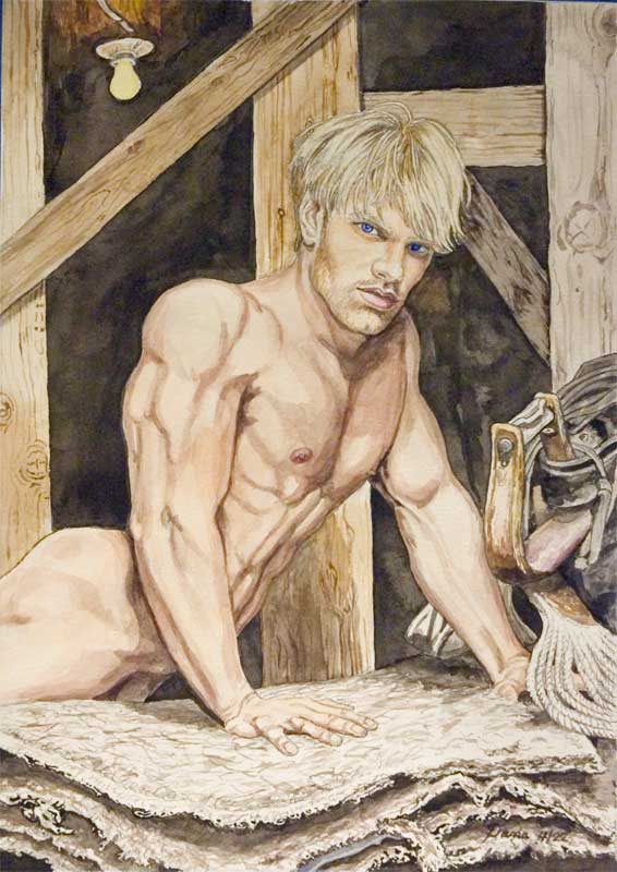 9.5" x 13" watercolor print cowboy-in-horse-barn