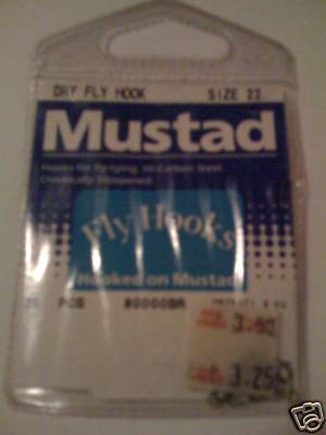 MUSTAD size 22 DRY FLY HOOKS, 80000BR . Straight, forged, turned down 30 degree extra small all eye, bronzed, small barb, dry fly hook. Packed 25 hooks per pegboard pkg.