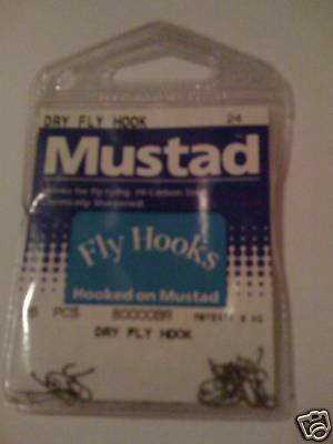 MUSTAD size 24 DRY FLY HOOKS, 80000BR . Straight, forged, turned down 30 degree extra small all eye, bronzed, small barb, dry fly hook. Packed 25 hooks per pegboard pkg.