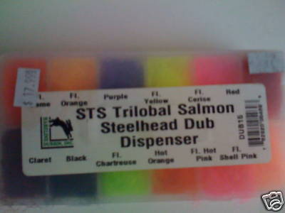 STS TRILOBAL DUBBING DISPENSER STEELHEAD COLORS: A soft, sparkly, easy to work with dubbing with excellent translucency and sheen. Great for tying Salmon & Steelhead patterns. In 12 really nice vivid steelhead colors! Great stuff and highly recommended! 12 COLOR ASSORTMENT: Fl. Flame Fl. Orange Purple Fl. Yellow Fl. Cherise Red Claret Black Fl. Chartreuse Hot Orange Fl. Hot Pink Fl. Shell Pink Check out my other items!