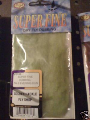 Wapsi Super Fine dry fly dubbing. Color pale evening dun. This is the finest dry fly dubbing. Synthetic, n the market. It is permanently waterproofed, and has good color highlights and sparkle. Very fine, 1.2 denier for even the smallest flies. Check out my other items!