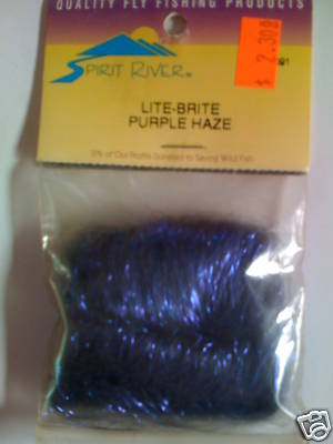 Spirit River Lite-Brite Dubbing color PURPLE HAZE. Lite-Bright is very fine flat Mylar flash chopped and blended with fine filaments of clear nylon to hold it together and provide loft. Normally it is distributed inside a dubbing loop and applied like a long knap chenille, then picked out to give it a hairy appearance. Lite-Brite dubbing reflects light in all directions and is nearly a supple as marabou or fin fur. Check out my other items!