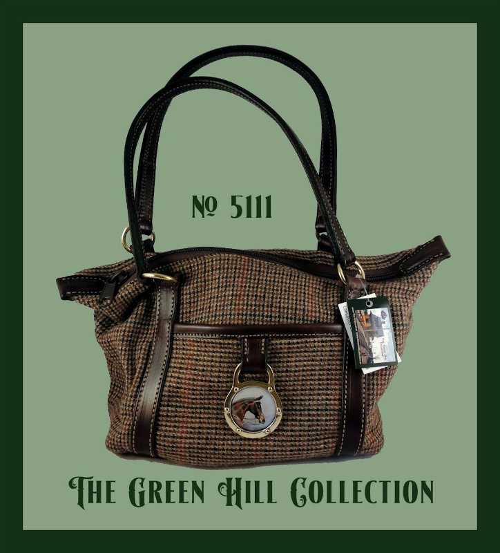 Small Wool Green Hill Bag. Shown in Brown, Red & Green Tweed Wool with Dark Brown Bridle Leather trim, Brass hardware and a Brass Grünen Hügel with our Horse Head image. Approximately 4-1/4" deep x 8" wide x 6" tall.