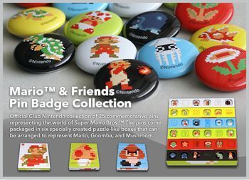 Official Club Nintendo collection of 25 commemorative pins representing the world of Super Mario Bros. The pins come packaged in six specially created puzzle boxes that can be arrange to represent Mario, Goomba, and Mushroom.
