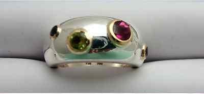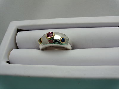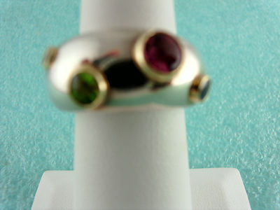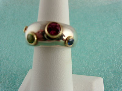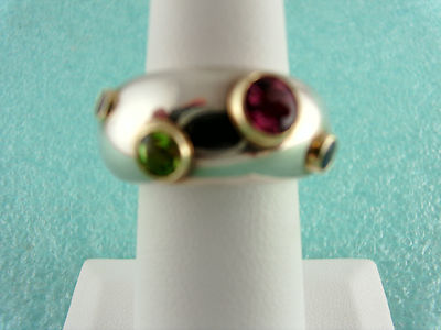 Size 5.75; 3/8" Wide; 15.5 Grams Weight Measurements Approximate TIFFANY & Co. Pouch & Box Included Insurance & Confirmation Included BEAUTIFUL BLUE SAPPHIRES (.25cttw), GREEN PERIDOT (25ct), AND PINK TOURMALINE (.45ct) GEMSTONES SET IN YELLOW 18K GOLD BEZELS ON A THICK WIDE STERLING SILVER BAND
