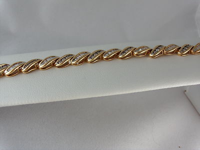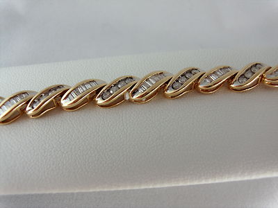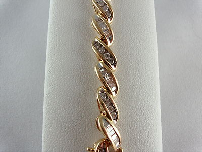 Full Cut Channel Set Rounds and Beautifully Cut Baguettes in Alternating Links Of High Polish Swirls of Solid Yellow Gold. Open Sides & Back Allow Light to Shine Through Diamonds to Show Off Their Brilliant Full Cut Sparkle. 17 Grams High Polish Finish in Solid 14K Yellow Gold 7 1/4" Length 1/4" Width 2 Safety Clasps in Addition to Secure Tongue Closure All Measurements Approximate