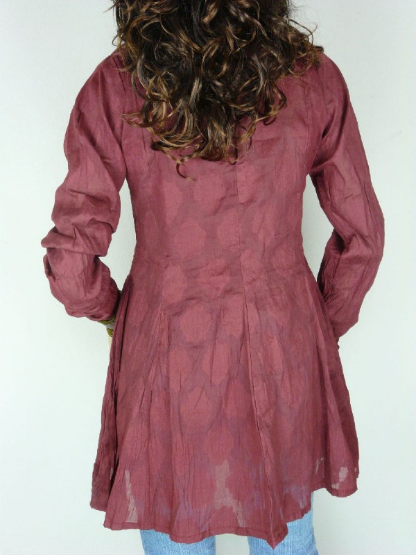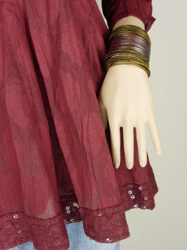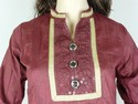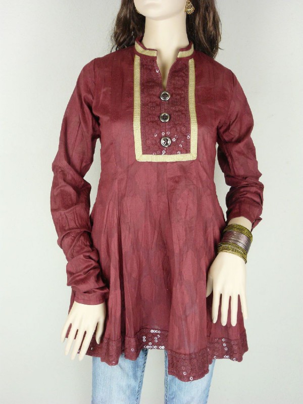 Chinese collar Burgandy Dhakai Self Printed Material with Transprarent Sequence work with Coat Buttons and Gold and White Zari Border