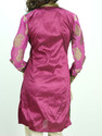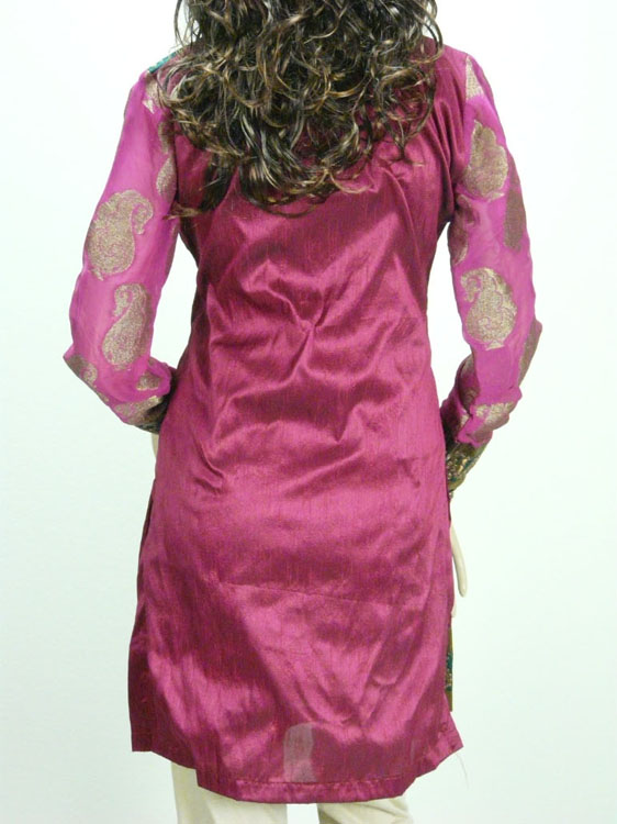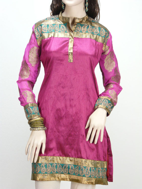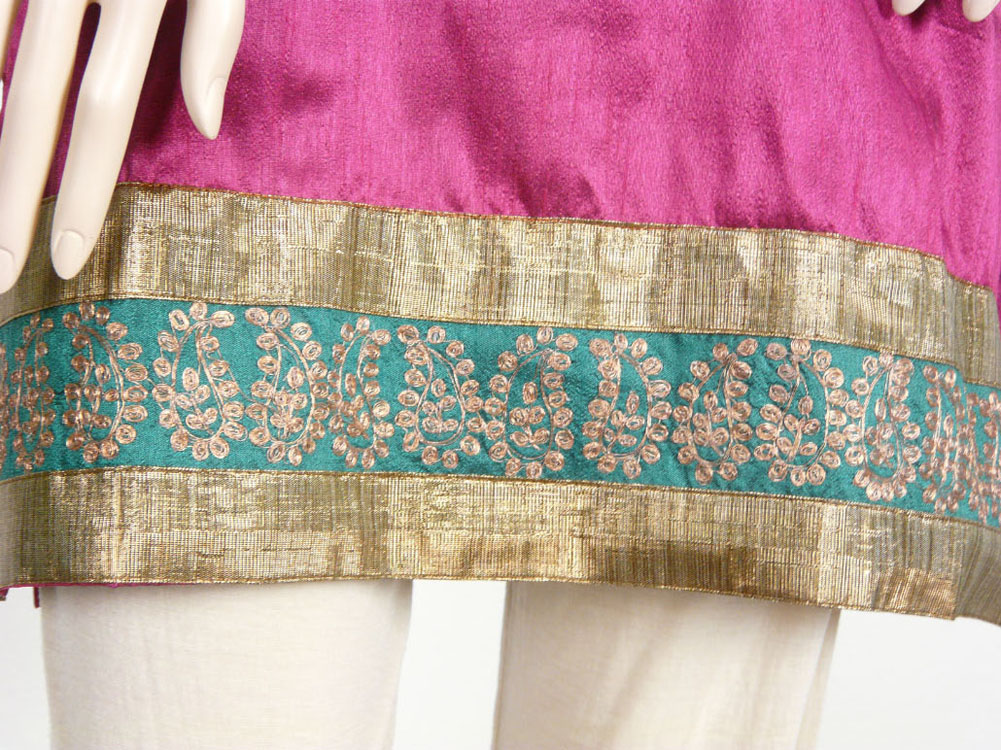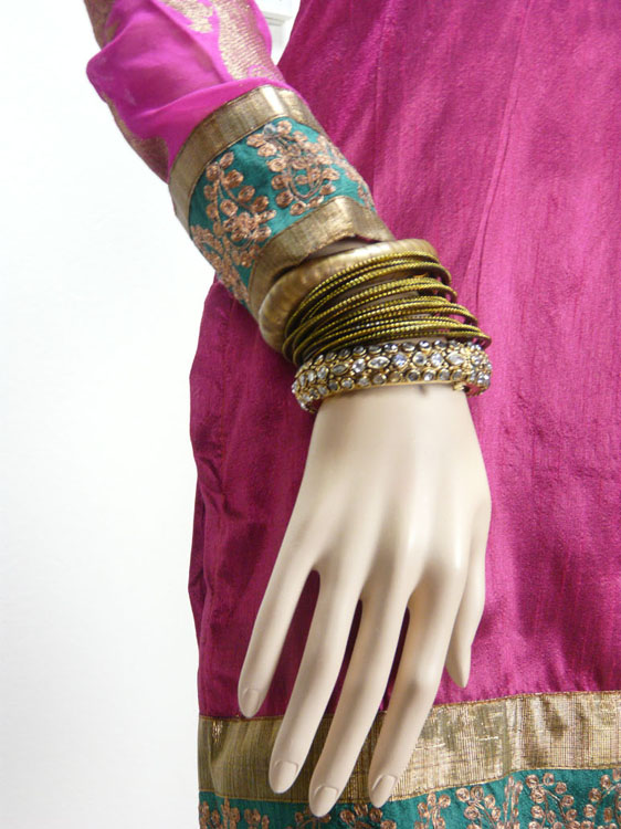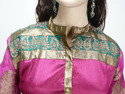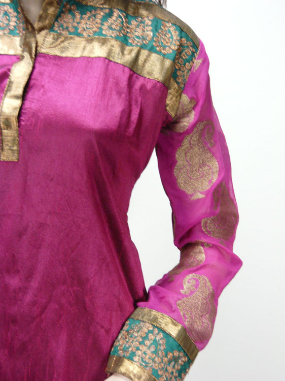 Bright pink colored raw silk with green and antique gold embroidery on shoulders, sleeves and botton rim - pink chiffon sleeved with gold kalkas
