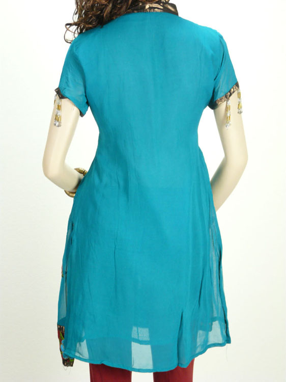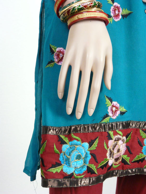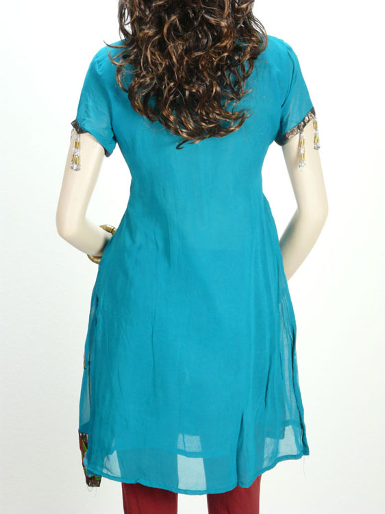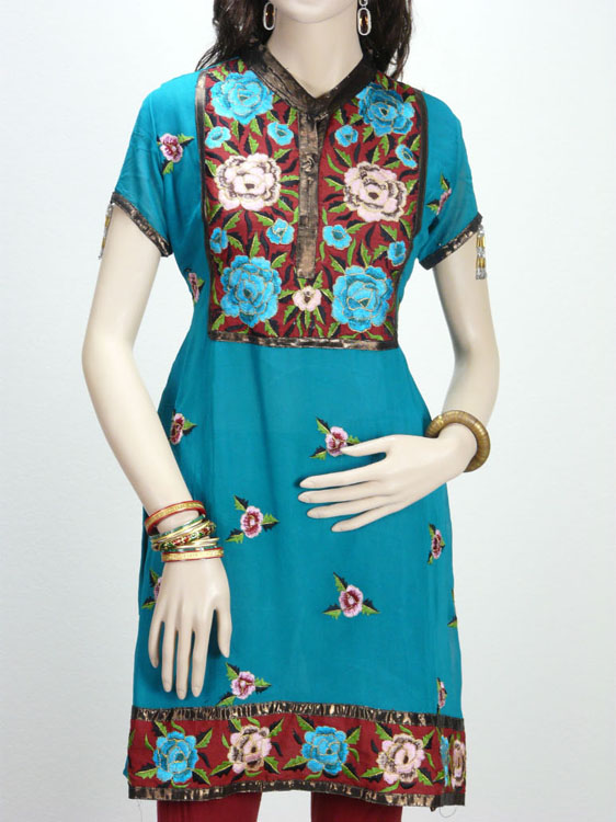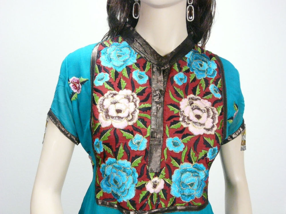 ​Blue Chiffon with Pink and Blue Rose Embroidery and beaded hangings at the end of both hand
