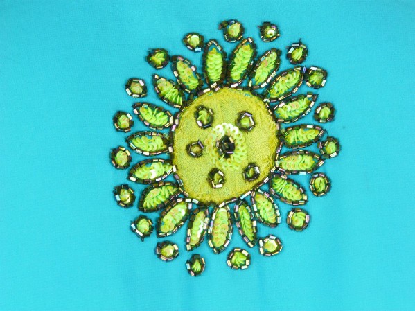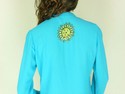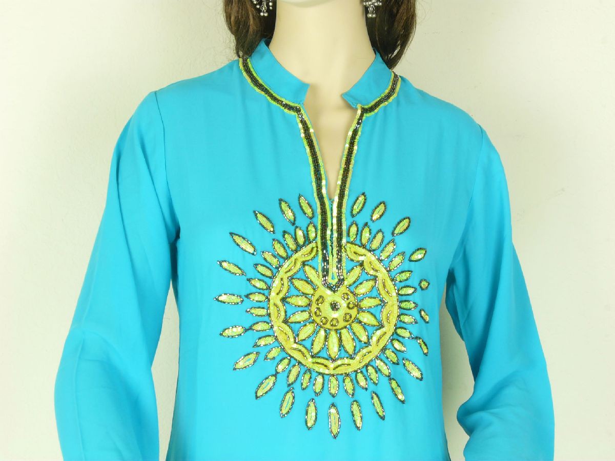 Chinese collar Turquoise solid-colored Crepe with Black and fluorescent bead work around neck and sleeves