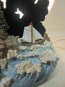 Attractive Resin Lighthouse perched on rocky cliffs with whitecap waves crashing against the cliffs with sailboat seeking safe harbor with lamp backdrop for accent lighting or nightlight.