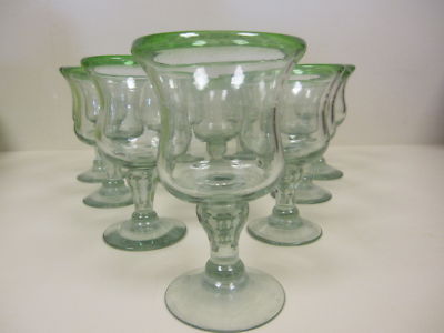 Set of 10 Margarita / Wine / Beverage Glasses Holds 8 oz of your favorite beverage Green & Clear Handblown Glass Approx 6" high with a 3 1/2" rim Because they are handblown glass, no two are exactly alike. There is a difference in height and diameter, but close (See the picture where they are all lined up and you will see the differences) In good condition with no chips, cracks or breaks. Will be packed very carefully to arrive to you safely.