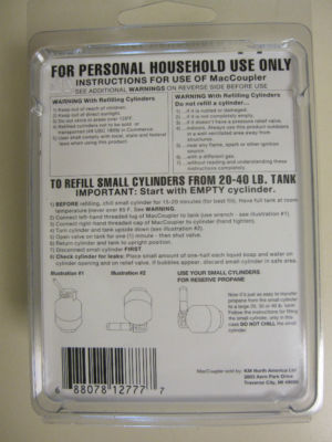 Why keep buying and throwing away those 1 lb. propane tanks? The MacCoupler E-Z Propane Filler allows you to refill those tanks in less than a minute from any 20-40 lb. propane tank!