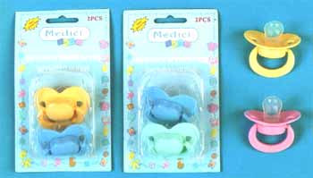 "2-Pack Pacifiers With Silicone Nipples. Comes in solid colors. Each packaged either Yellow/Blue, Blue/Green or Pink/Yellow. You will receive a random assortment of packages." Case Pack 144