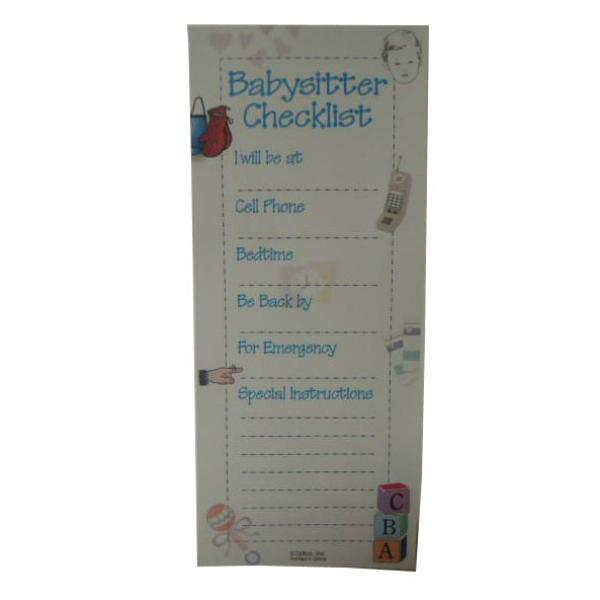 "Babysitter Checklist. Magnetic notepad hangs easily on your refrigerator so the babysitter has all of the necessary information for caring for your little one. Includes space for cell phone number, bedtime, for emergency and special instructions. 60 sheets per pad. Measures 9 X 4." Case Pack 60