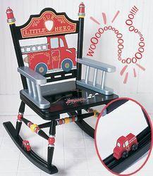 Cut-out detail around fire truckFire hydrant finials and ladder design armsHear the fire engine's siren when child rocks! (Don't worry, Mom - you can turn it off!)Special understamp beneath the seat that the customer can personalize with the childs name, the name of the gift-giver and the special occasion when the chair is receivedPhoto greeting card included so the child can say "THANK YOU" in a memorable way