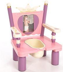 Child's Potty training seat, deflector, converts to regular chairCrown backrest with special message: "Her Majesty's Throne"4" x 6" photo frame to make it her own!Removable plastic container lifts out for easy clean-upComes with a removable deflector