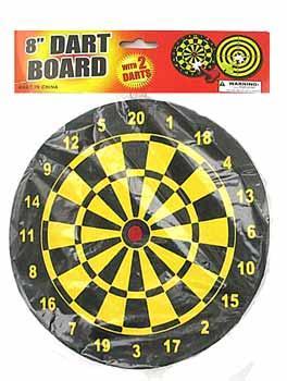"This one is not a child's toy dartboard! A 2 sided painted wood dartboard with metal edge ring and hanging loop. Comes with 2 plastic feathered darts. The 8"" diameter dartboard is black and yellow with red bull's eye and has a different game on each side. The hanging ring diameter is 1/2"". The darts are 4 7/16"" long. They have clear plastic tip covers and solid plastic feather heads. The set comes in a poly bag with header card and UPC code." Case Pack 48