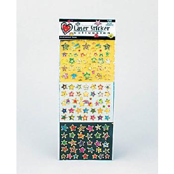 "Glitter laser stickers in bright colors with gold edging. 90 piece sticker assortment styles: Flowers, Hearts, and Stars. Diameters range from 1/4"" to 1 1/4"" depending on style. Comes in a poly bag with UPC code. Imported." Case Pack 72