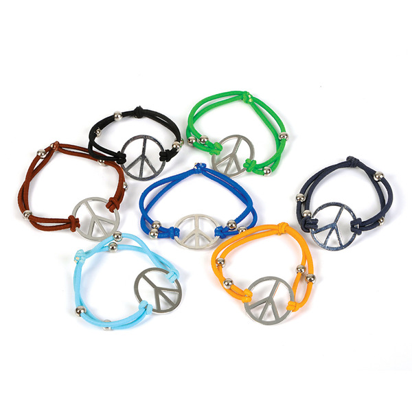 "A beautiful touchtone to the Flower Power generation of the 1960's. These elastic bracelets feature a metal peace sign as the centerpiece. Assortment of colors may vary." Case Pack 36